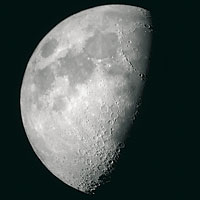 Over: Månen natt til 18. april 2005. Foto: Leif Knudsen, Nikon Coolpix 995 håndholdt på Orion 120 mm refraktor gjennom 25 mm okkular. |