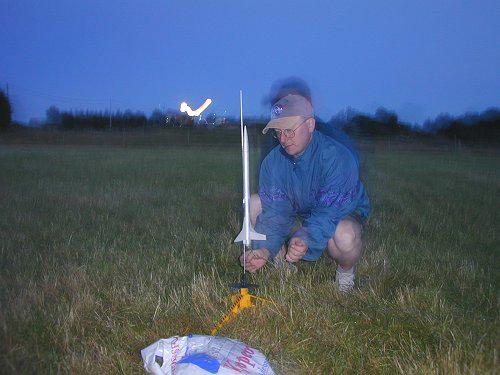 DSCN2977.jpgEgenutviklet "sølvpil" som gikk relativt høyt (anslagsvis 200 meter). I skumringsmørket begynte det å bli vanskelig å finne igjen delene og overhodet se den mot kveldshimmelen. Det var ingen som kunne si sikkert hvor den ville lande...